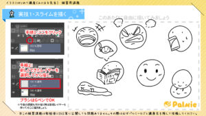 本日のパルミーの課題。スライムを描いてみようとのことで、喜怒哀楽を表現できるように意識しました